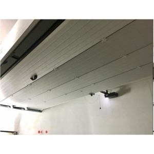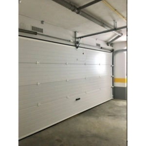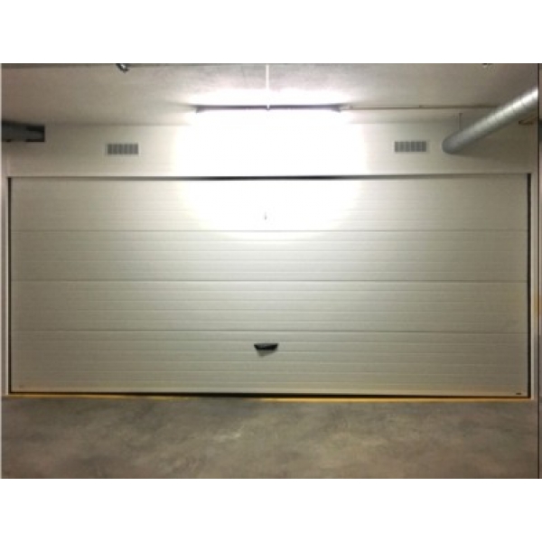 Colocação de portão de Garagem seccionado de 5 metros com painéis canelados em branco e padieira em painel com grelhas de ventilação. Sistema de automatismo Dítec completo.