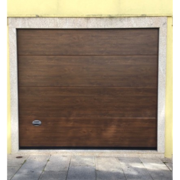 Instalação de portão de garagem seccionado com painéis imitação de madeira. Sistema de automatismo Roger. Todos os trabalhos realizados têm garantia de 2 anos. Damos assistência e manutenção a qualquer momento.